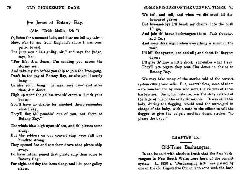 "Instead of an implicit acceptance of the rules of society, there is an explicit assumption that society itself is out of joint, and even a hint that in the new land society may be remoulded nearer to the heart's desire". Frank Clune in hisWild Colonial Boys has the bushranger Ben Hall singing 'Jim Jones' to an appreciative audience. Although not collected in the field the song has had a remarkable new life since the 1950's, often sung where a song of defiance is called for. In Westminster Hall in London in the early 1970's I recorded Bert Lloyd singing it to a huge audience at a rally for the release of Angela Davis.Searchable archives of Irish transports are now available on at The National Archives of Ireland