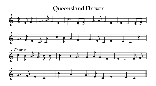 'Queensland Drover' or 'The Overlander' seems to have been collected with three different tunes. This version uses the tune John Manifold learned from his father, who learned in about 1900. The song was printed in Patersons Old Bush Songs.