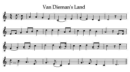 This version collected by Lucy Broadwood in England around the turn of the century, The National Library in Canberra has a copy of an 1830's broadside 'Van Dieman's Land' from Taylor of London. This is reprinted in Hugh Anderson's Farewell to Old England Transportation to Van Diemen's Land continued until 1853 when the island was renamed Tasmania.