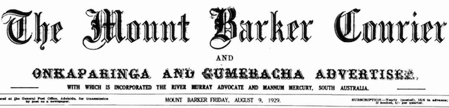From the NSW Newspaper The Mount Barker Courier and Onkaparinga and Gumeracha Advertiser 9 Aug 1929 p. 1.