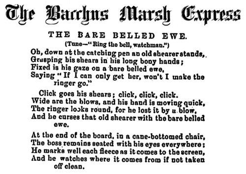 Discovered in the Victorian Newspaper the Bacchus Marsh Express through the National Library of Australia TROVE project and corrected by Mark Gregory, 4 June 2013 searching for "tar here jack"This song was referred to in 1925 in an article in the NSW newspaper the Newcastle Sun Saturday 19 December 1925 about the export of Australian wool for export "...the bales have already left the warehouses in lorries and rail vans, or have been loaded on steamers for America or Europe. From Australia, where the old shearers' song (if any sing it now) of "The bare bellied yeo (ewe)" has been chanted over them, they have reached a place of new incantations, where the language is of yarns and tops and soils and laps and wastes..."