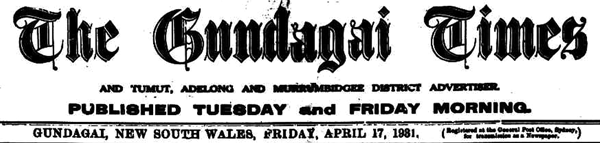 From the NSW newspaper the Gundagai Times and Tumut, Adelong and Murrumbidgee District Advertiser of Friday 17 April 1931, p. 2.