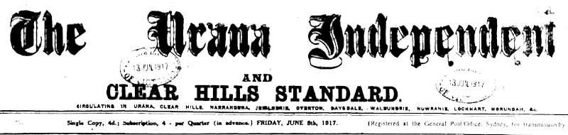 Urana 30/6/17. NotesFrom the NSW Newspaper the Urana Independent and Clear Hills Standard 8 Jun 1917 p. 5.