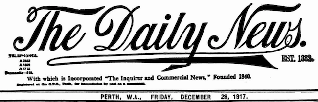 From the West Australian Newspaper The Daily News 28 Dec 1917 p. 6.