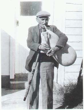 The late Veljan Vasilevsk playing the non-Greek Macedonian gaida, a bagpipe with double-reed chanter and single-reed drone