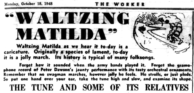 Waltzing Matilda as we hear it today is a caricature. Originally a species of lament, to-day it is a jolly march. Its history is typical of many folksongs. Forget how it sounded when the army bands played it. Forget the gramophone record ot Peter Dawson's jaunty performance with its tasty orchestral ornaments. Remember that no swagman marches, however jolly he feels. He strolls, or just plods. So put one hand over your ear, take the tune high and slow, and examine its shape.